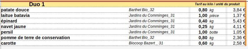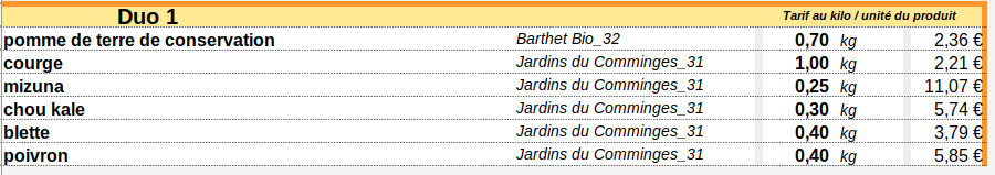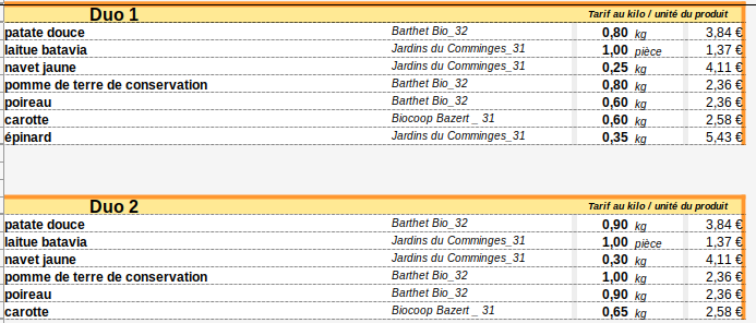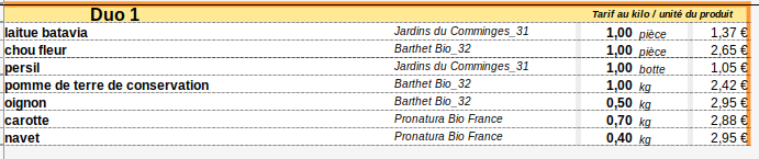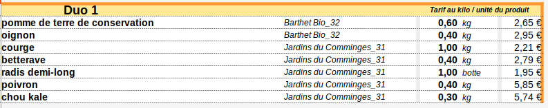 - Panier Duo (4 à 5 légumes différents) : 12 € ==> 13€ au 1er Juillet